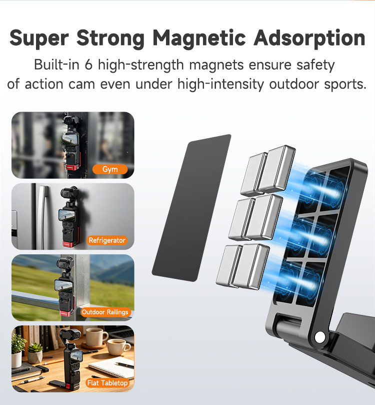 - Super Strong Magnetic Adsorption. Built-in 6 high-strength magnets ensure safety of action cam even under high-intensity outdoor sports.