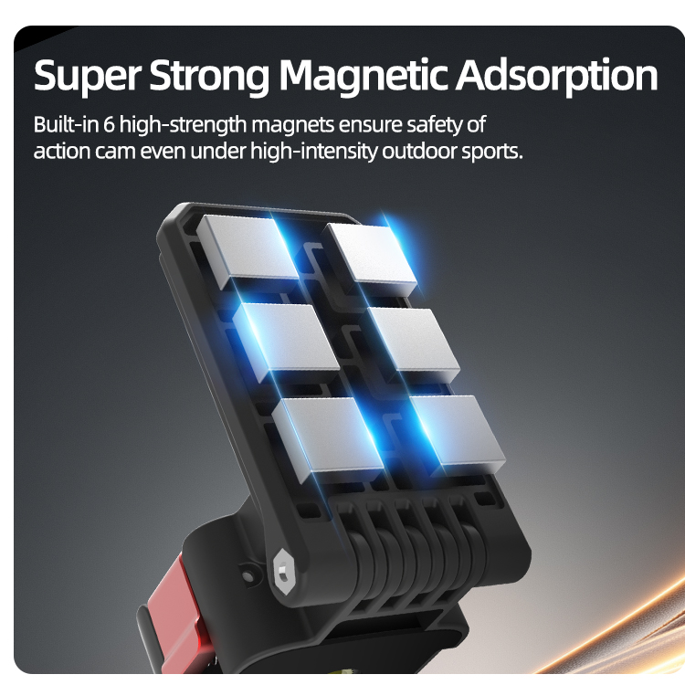 - Super Strong Magnetic Adsorption. Built-in 6 high-strength magnets ensure safety of action cam even under high-intensity outdoor sports.